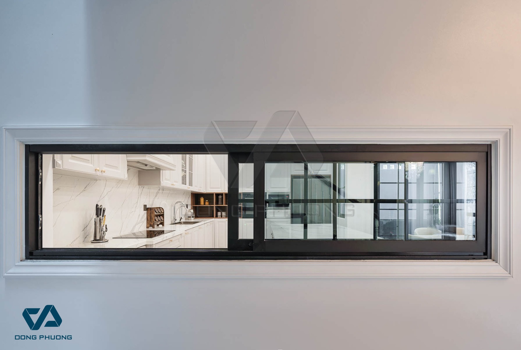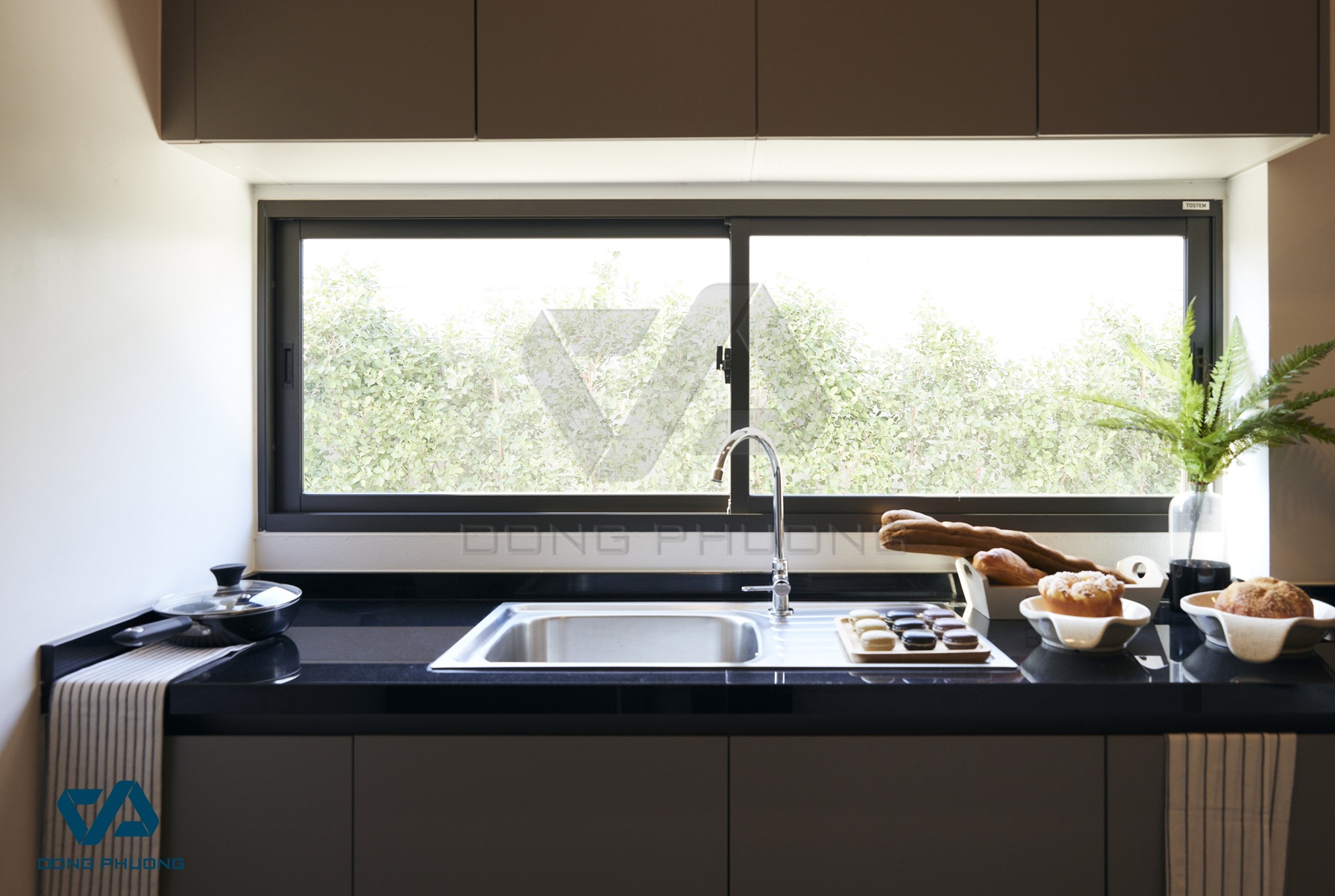 Hướng từ trong nhà nhìn ra cho mẫu cửa sổ lùa từ bếp