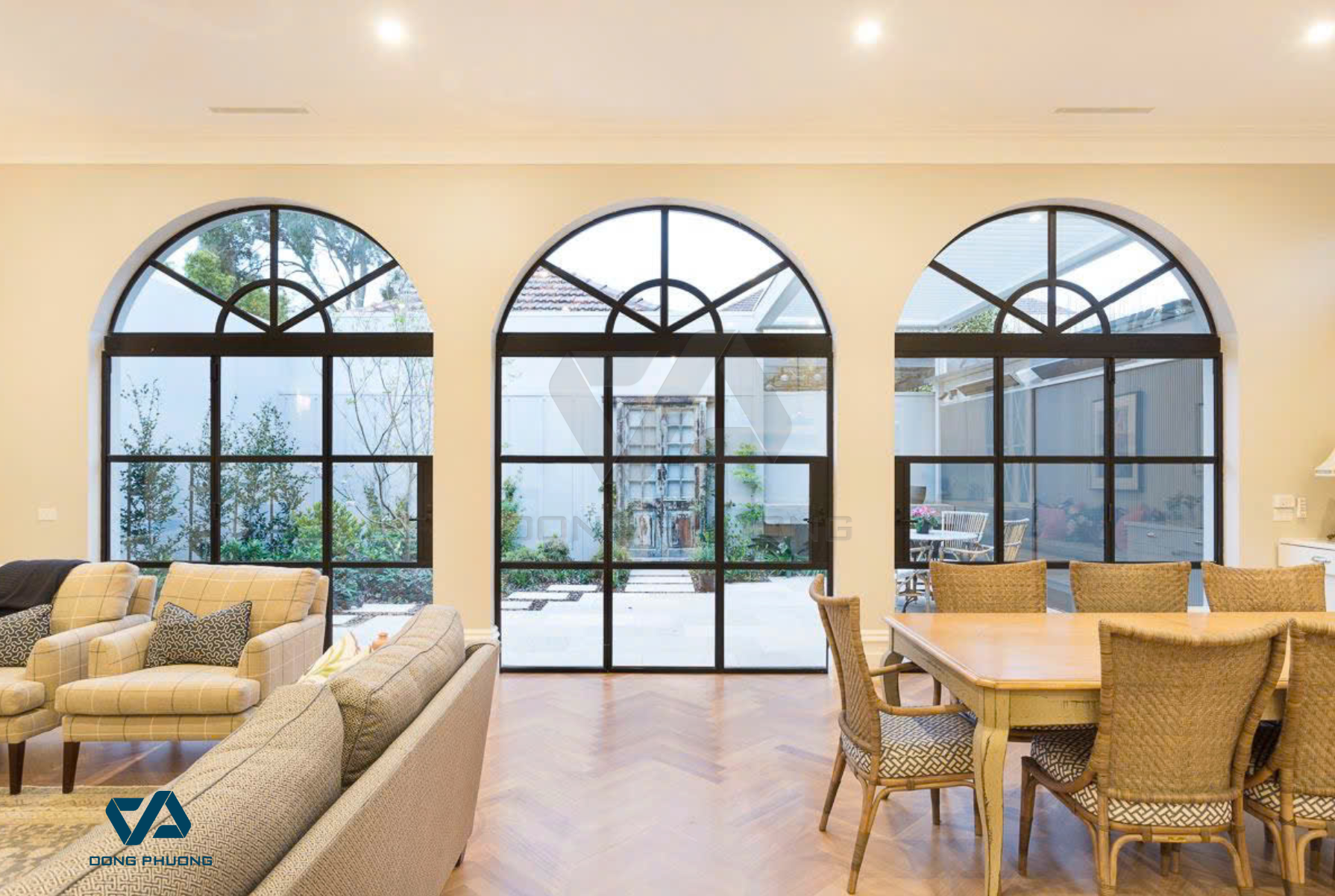 Nếu biệt thự mang phong cách tân cổ điển hoặc Địa Trung Hải, cửa vòm nhôm kính CNC là điểm nhấn nghệ thuật không thể thiếu. Đường cong uyển chuyển kết hợp kỹ thuật cắt CNC tinh xảo giúp ngôi nhà vừa cổ điển, vừa hiện đại.