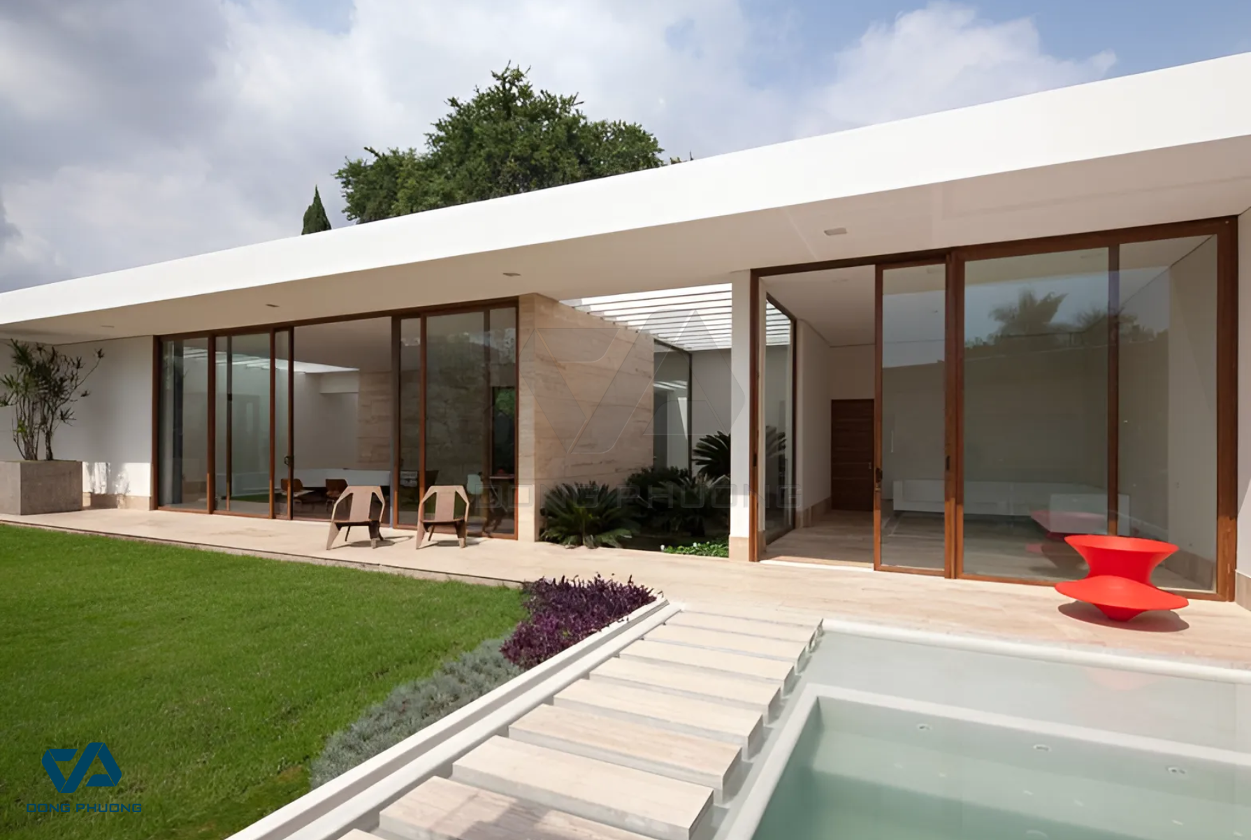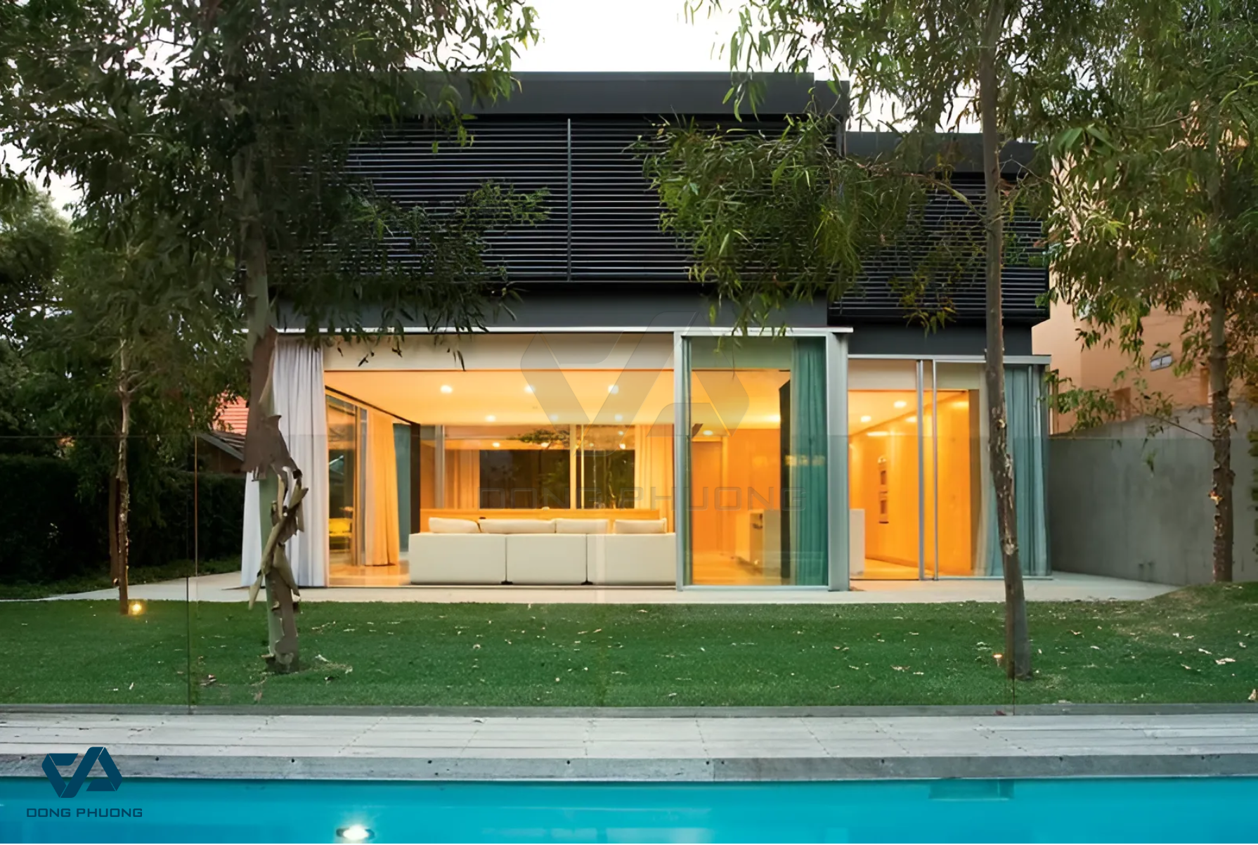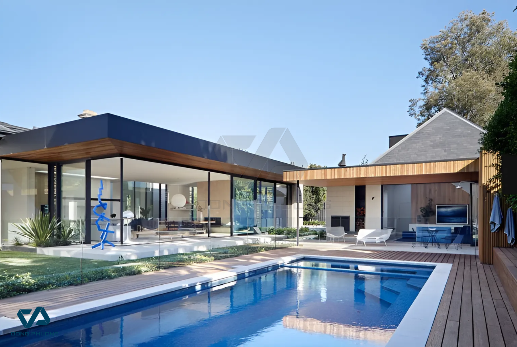 Gia chủ ưa chuộng cửa toàn kính (full glass) để mở rộng tầm nhìn ra sân vườn hoặc hồ bơi. Đây cũng là cách mang thiên nhiên vào không gian sống, tạo cảm giác thoáng đãng.