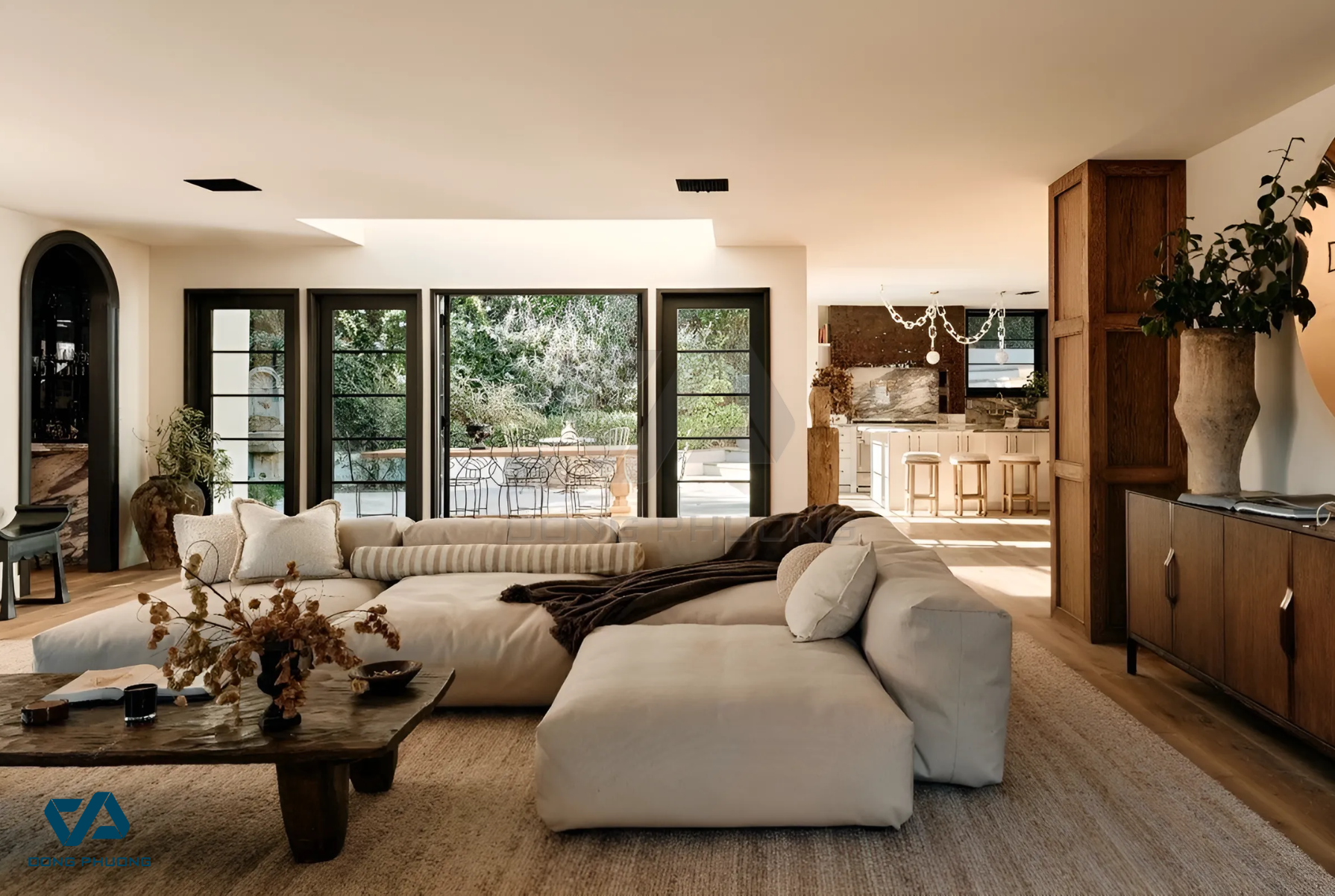Xu hướng “Less is More” vẫn thống trị năm 2025. Cửa chính sử dụng khung nhôm mảnh, màu trung tính, loại bỏ chi tiết thừa thãi để làm nổi bật không gian rộng và ánh sáng tự nhiên.