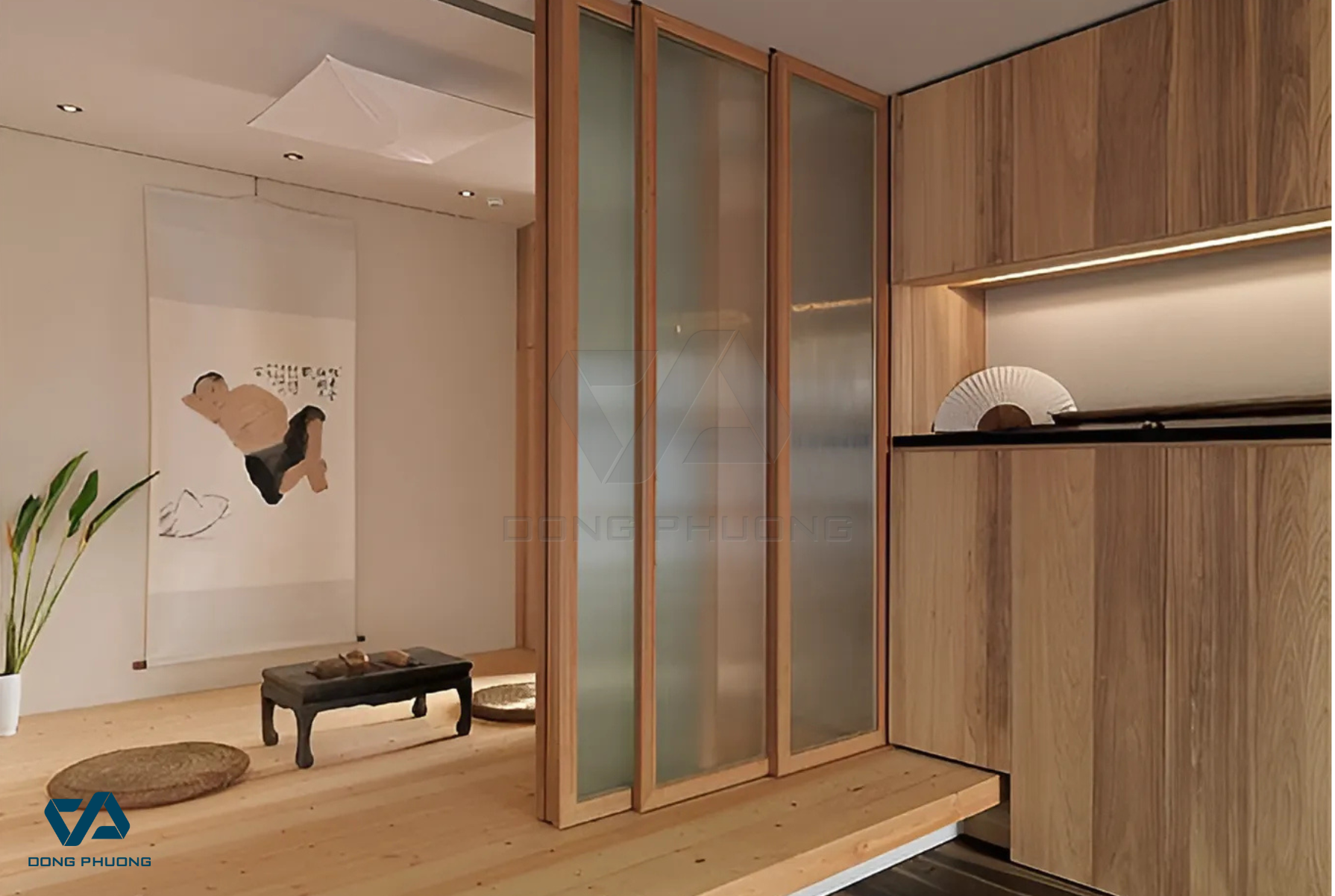 - Japandi – giao thoa Nhật – Bắc Âu: Nhôm sơn vân gỗ kết hợp kính mờ đục, cửa vừa kín đáo, vừa thanh tịnh. Thích hợp với những ai sống nội tâm, yêu sự yên tĩnh và gọn gàng đến từng chi tiết.