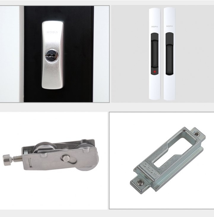 Thiết kế vách kính hai bên và cửa lùa ở giữa, bốn khung đều là khung slim, khung dưới sử dụng thiết kế không có chướng ngại, có độ dốc. Bánh dẫn hướng và bánh xe dưới có thể điều chỉnh, đảm bảo khả năng chịu lực và độ bền cao.