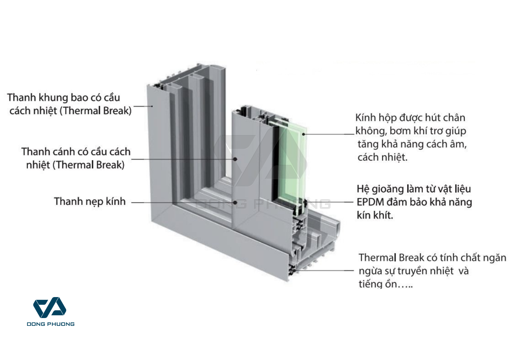 Gioăng (thường làm từ EPDM cao cấp) là bộ phận nằm giữa khung và kính/cánh cửa, có nhiệm vụ: