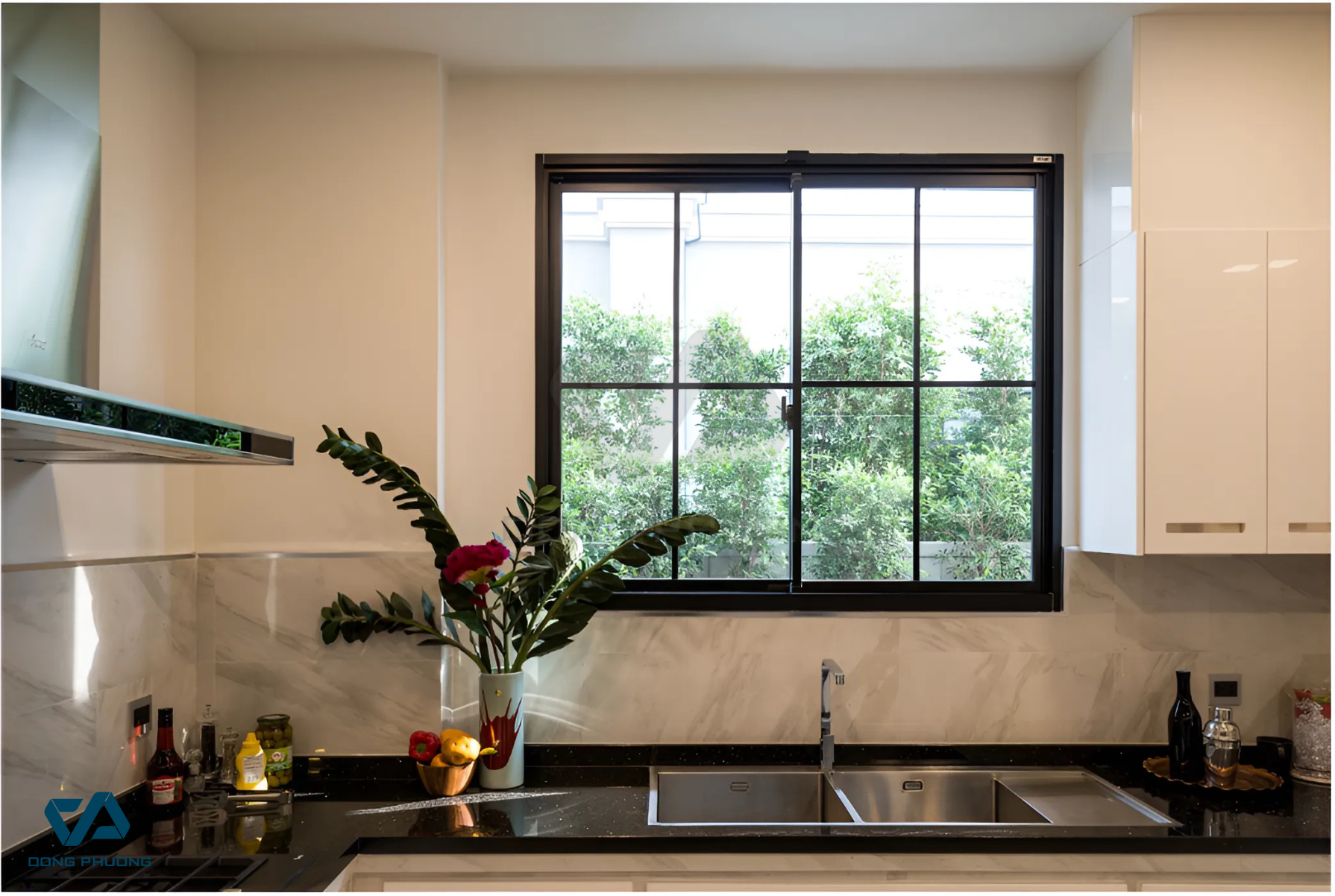 Vẻ đẹp mộc mạc của gian bếp trở nên nổi bật nhờ hệ cửa trượt Tostem đen sần (Nguồn: Tostem)