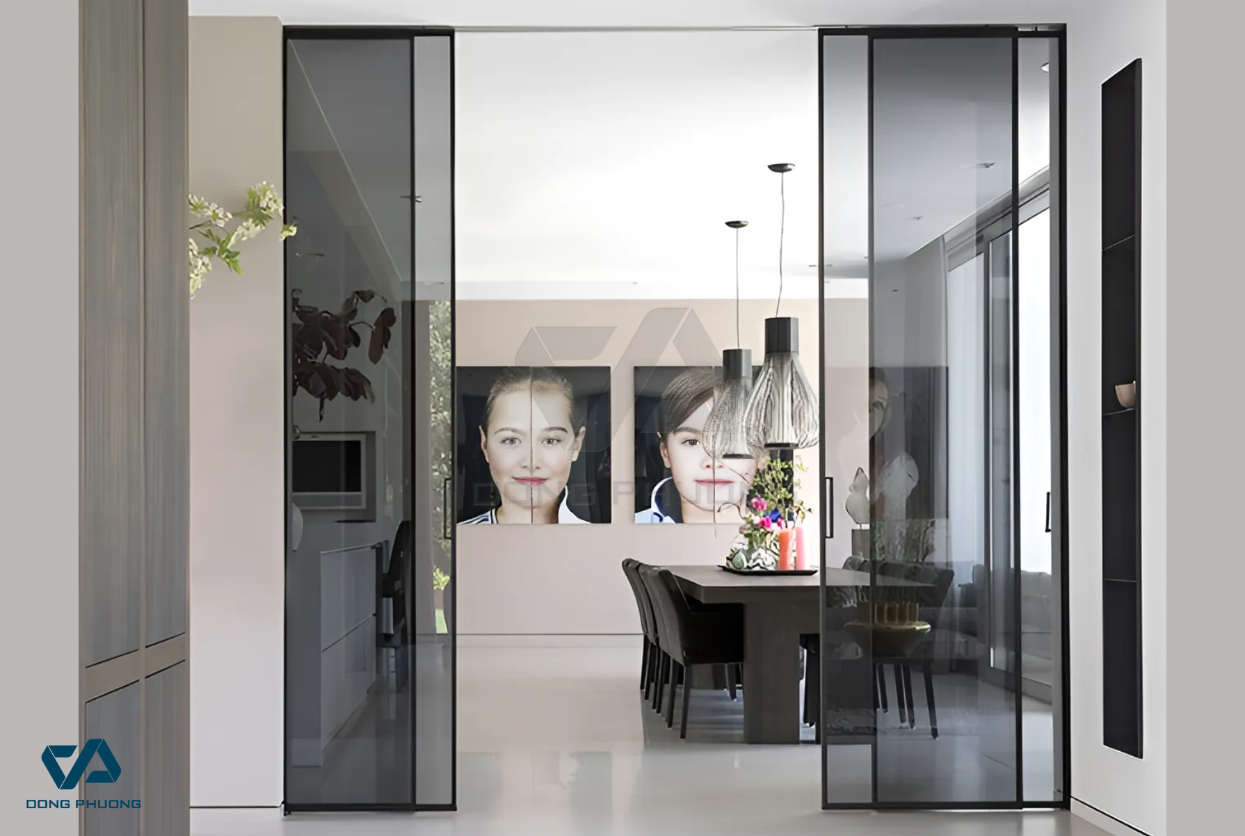 Ví dụ: Một căn penthouse tại Quận 7 sử dụng cửa lùa treo kính trong suốt ngăn phòng khách và phòng làm việc. Khi tiếp khách, gia chủ mở toàn bộ để tạo không gian rộng; khi làm việc, chỉ cần kéo nhẹ để có sự riêng tư.