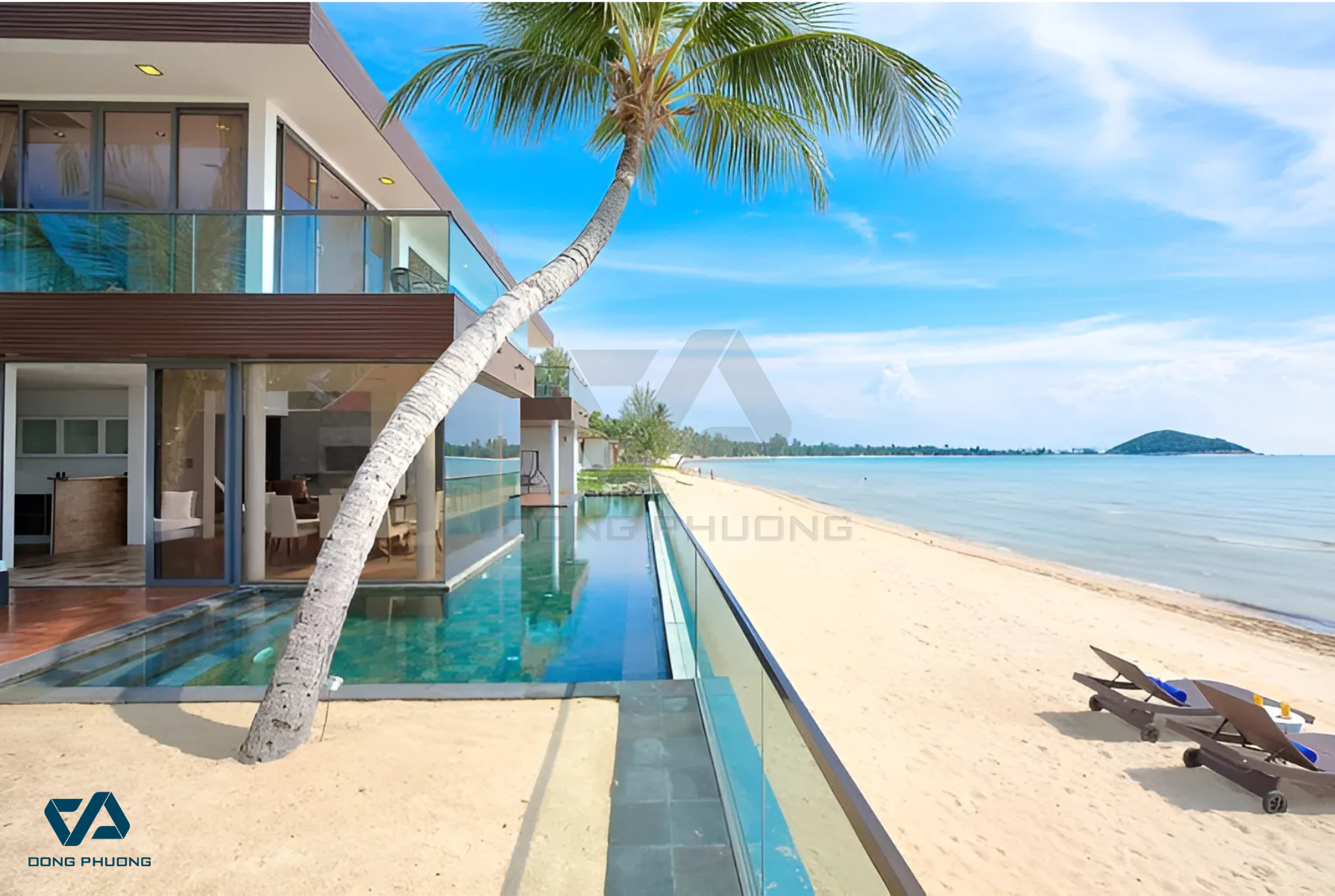 Ở môi trường ven biển, một bộ cửa không chỉ cần bền bỉ mà còn phải đáp ứng thẩm mỹ cao, tôn lên kiến trúc, mở rộng tầm nhìn và tạo cảm giác sang trọng, hòa hợp với thiên nhiên. Dưới đây là những gợi ý thiết kế cửa nhôm kính phù hợp với từng loại công trình ven biển mà Đông Phương Plus từng thi công: