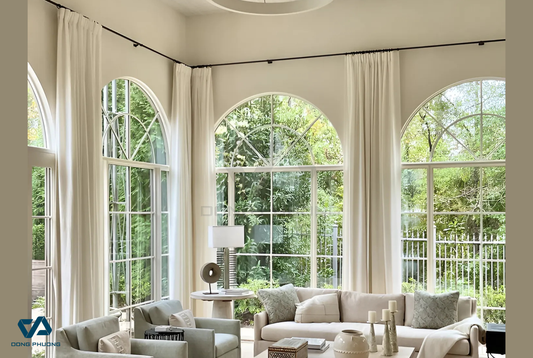 Bên cạnh đó, hệ phụ kiện đồng bộ (như HOPO, Roto, Romadio...) hỗ trợ cửa cong vận hành êm ái, hạn chế hư hỏng, tối ưu tuổi thọ sử dụng.