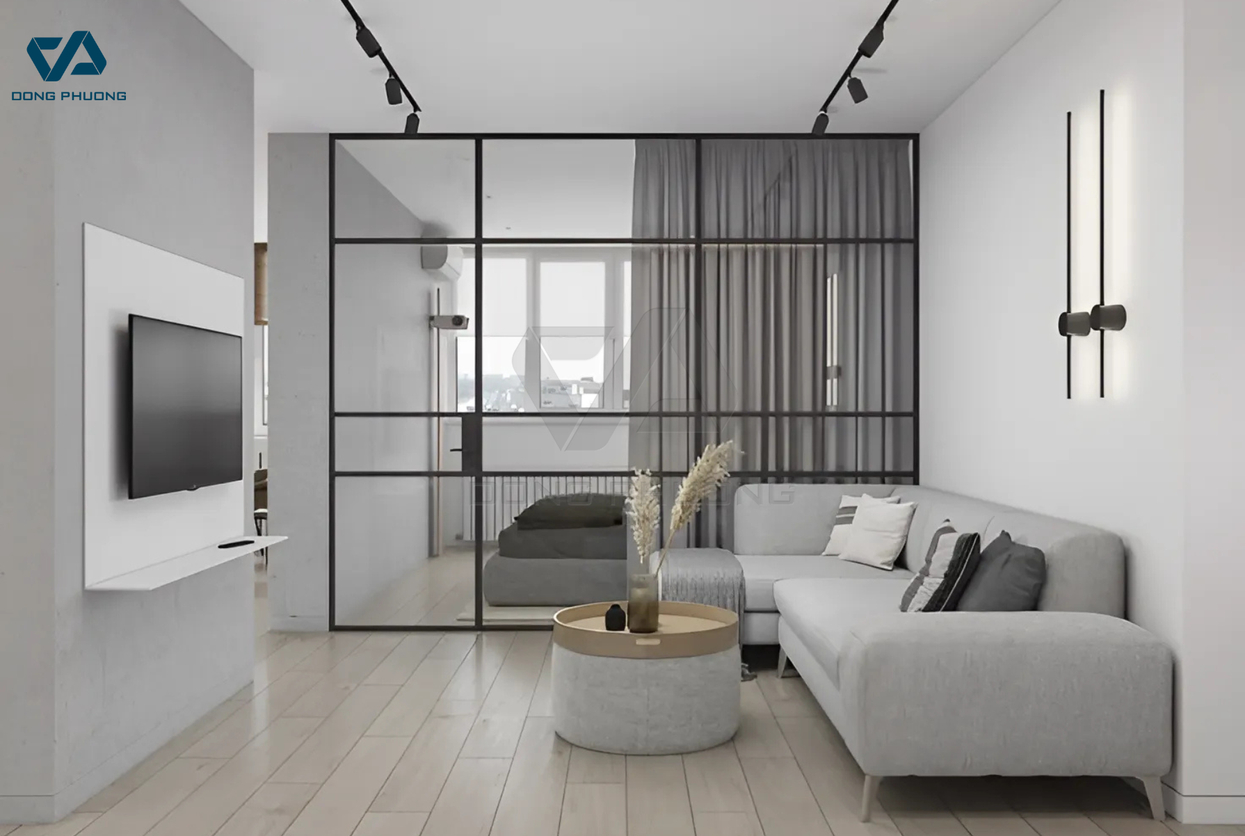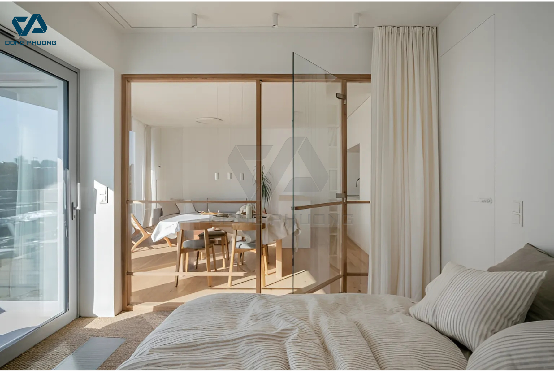 Nhờ vào khả năng xuyên sáng và thiết kế trong suốt, vách nhôm kính giúp không gian phòng ngủ như rộng rãi, thoáng đãng hơn rất nhiều – đặc biệt hiệu quả với những căn hộ có diện tích nhỏ dưới 50m².