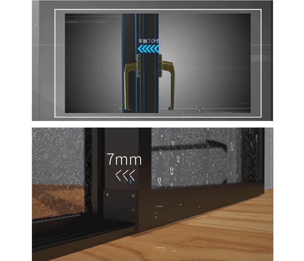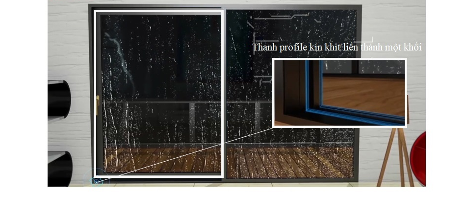Thông qua thao tác tay nắm, cánh lùa sẽ di chuyển 7mm ép vào cánh cố định, từ đó thực hiện ép toàn bộ gioăng bao xung quanh hệ thống khóa lại, để cửa thực hiện chức năng kín khó, kín nước, và cách âm tối ưu, đạt hiệu quả kín khít cao.