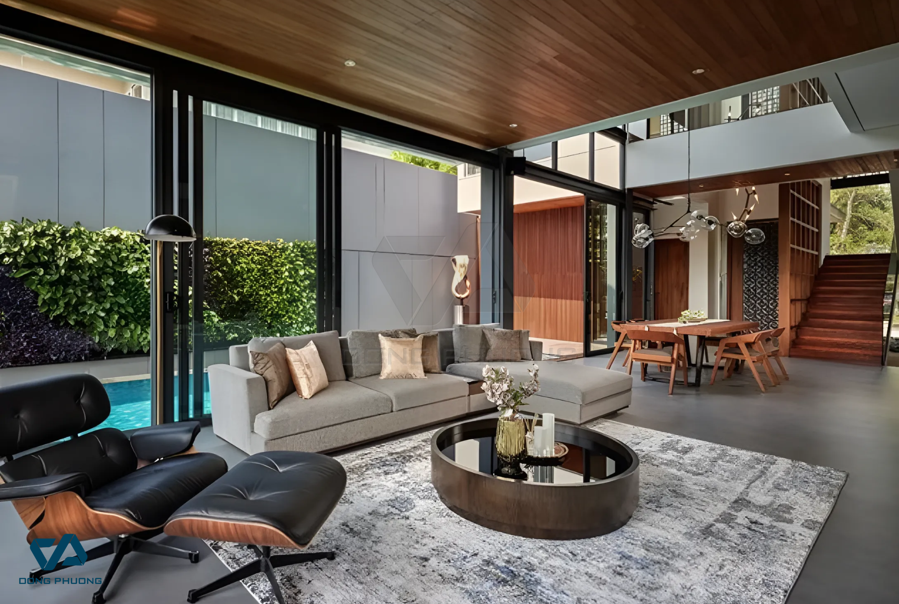 - Cửa trượt âm ray, khung siêu mỏng, kính phản quang hoặc kính màu khói – giúp không gian có chiều sâu, tránh ánh nhìn trực diện từ bên ngoài.