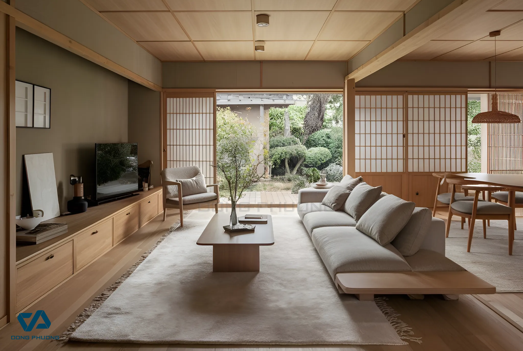 Điểm đặc trưng của phong cách Nhật Bản là sử dụng tối thiểu vật dụng, bố cục ngang dàn trải, tạo cảm giác yên bình và mở rộng không gian theo chiều sâu. Chất liệu như gỗ, tre, đá, giấy washi hay kính thường xuyên xuất hiện để mang thiên nhiên vào trong nhà mà không bị tách biệt bởi ranh giới vật lý.