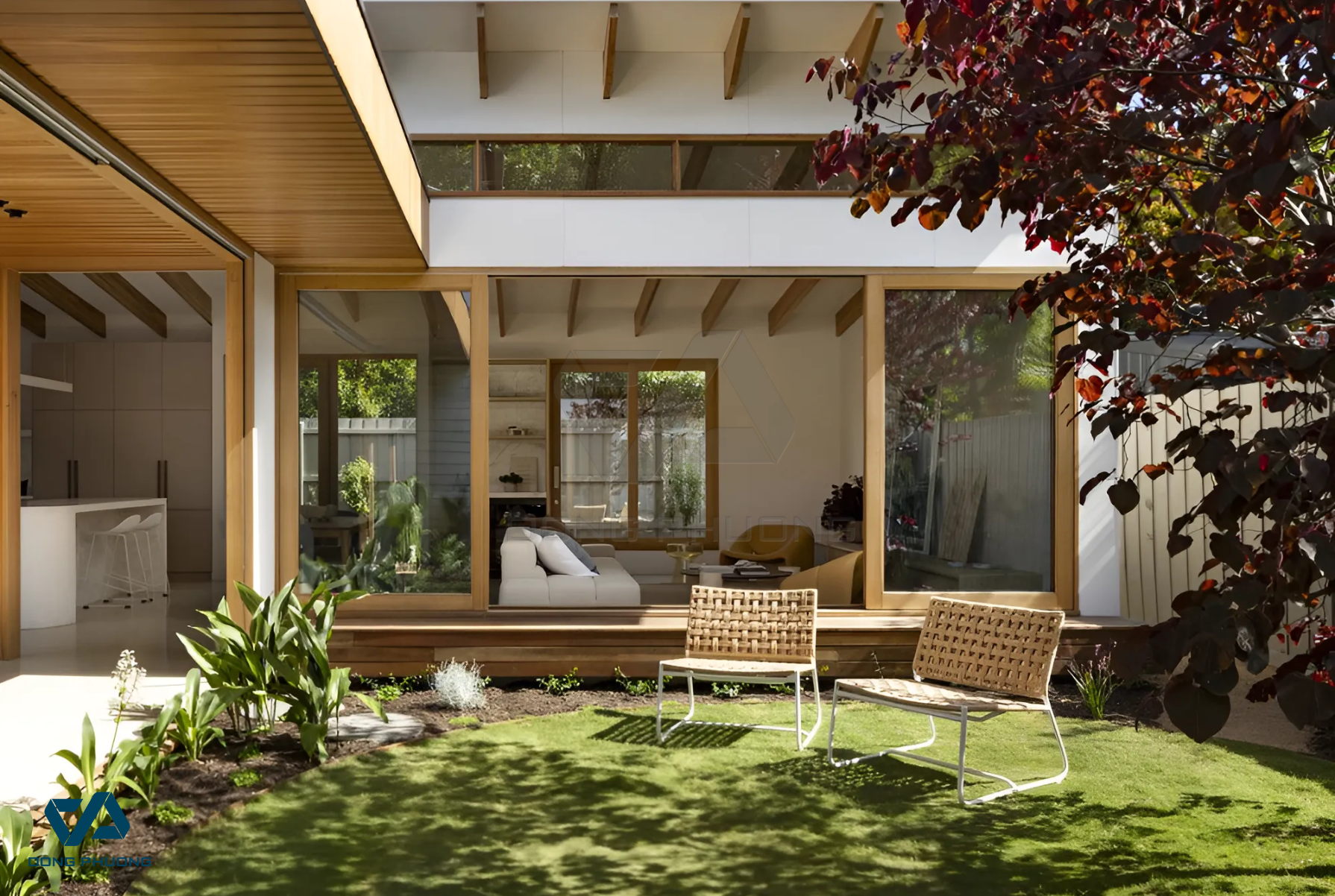 - Cửa xếp trượt mở rộng ra khu vườn: phù hợp với không gian thiền định, giúp ngôi nhà “thở” cùng thiên nhiên.