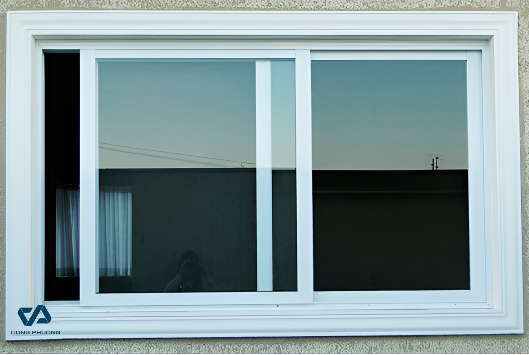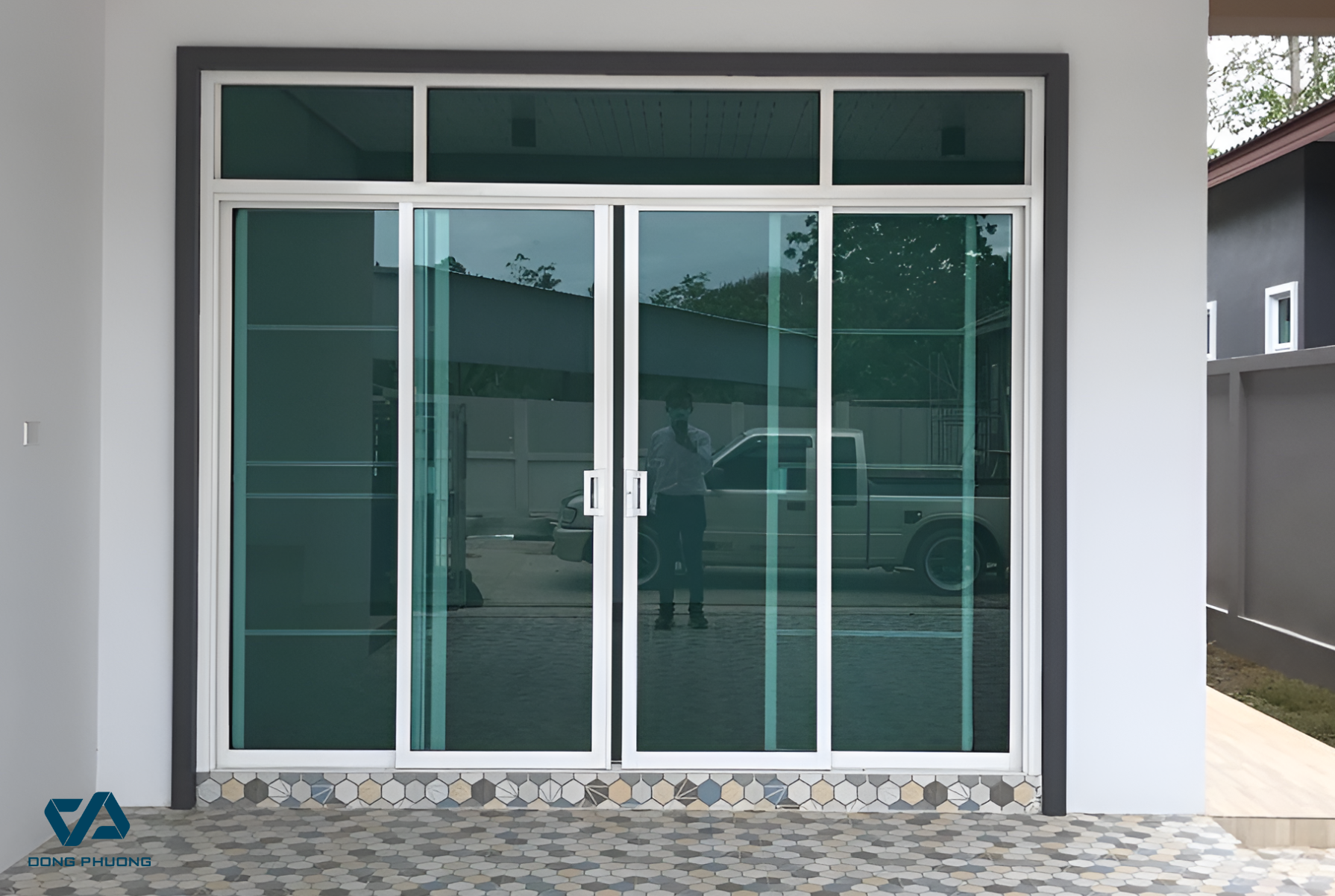 Cửa nhôm kính lùa với khung nhôm trắng và kính tối màu, thiết kế hiện đại nhưng dễ hư hại nếu chất liệu kém (Nguồn: Internet)