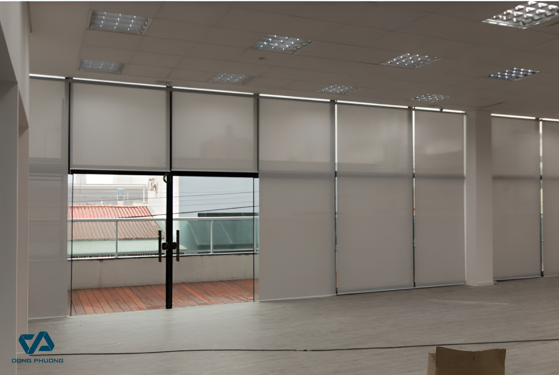 Cửa nhôm kính văn phòng kết hợp rèm chắn sáng, mang lại không gian mở rộng nhưng dễ cong vênh nếu dùng nhôm mỏng (Nguồn: Internet)