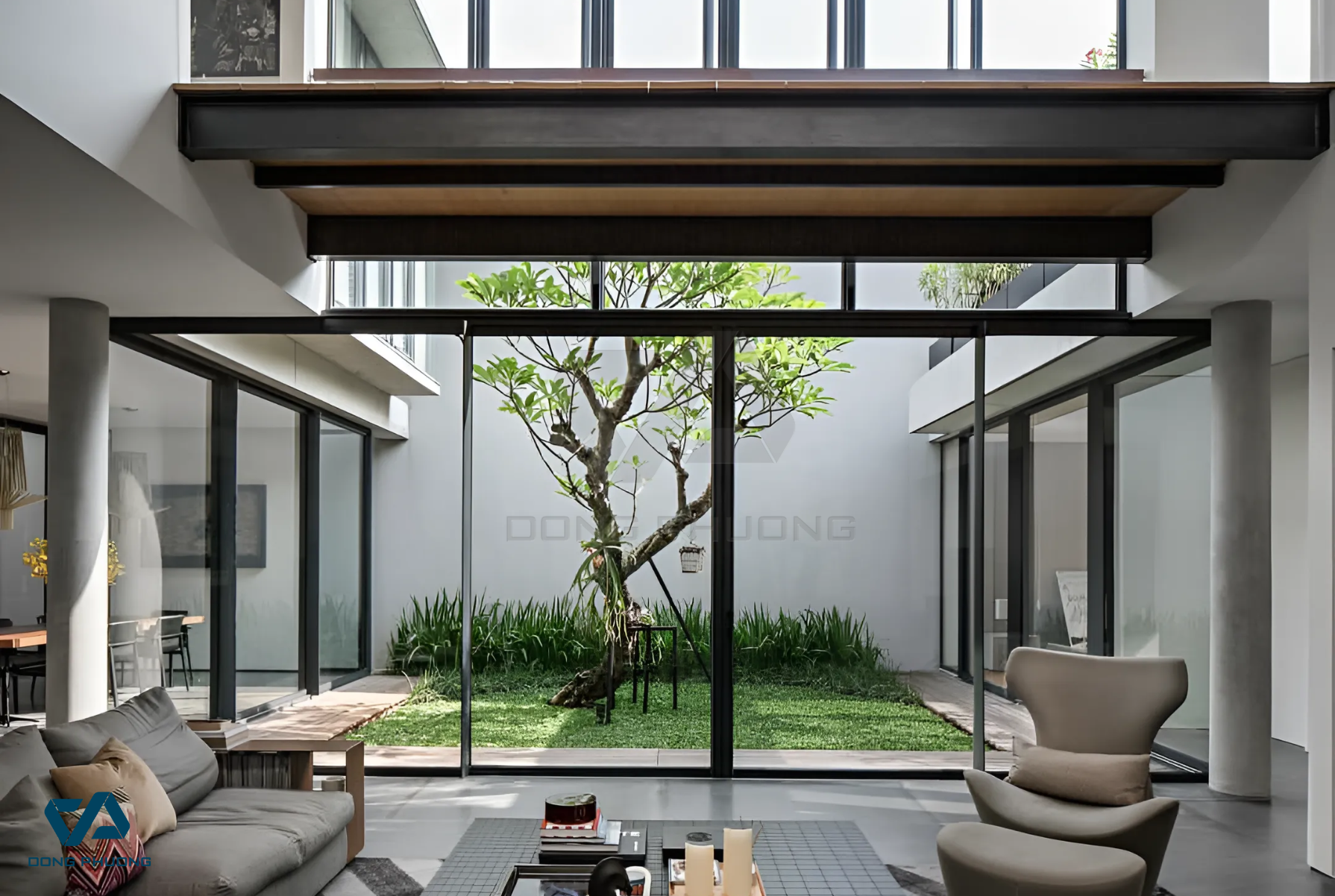Cửa nhôm kính panorama cho phép ánh sáng lan tỏa khắp không gian, giảm thiểu sử dụng đèn điện ban ngày, giúp tiết kiệm năng lượng.