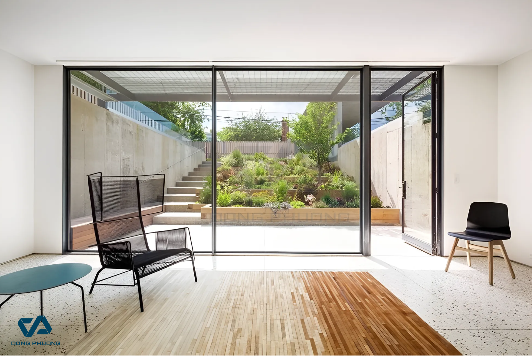 Cửa trượt panorama là dòng cửa kính trượt khổ lớn, có thiết kế khung nhôm siêu mảnh, tối giản đến mức gần như “biến mất” để mở rộng tầm nhìn. Toàn bộ diện tích cửa gần như là mặt kính trong suốt, mang lại cảm giác liền mạch giữa không gian trong và ngoài nhà.