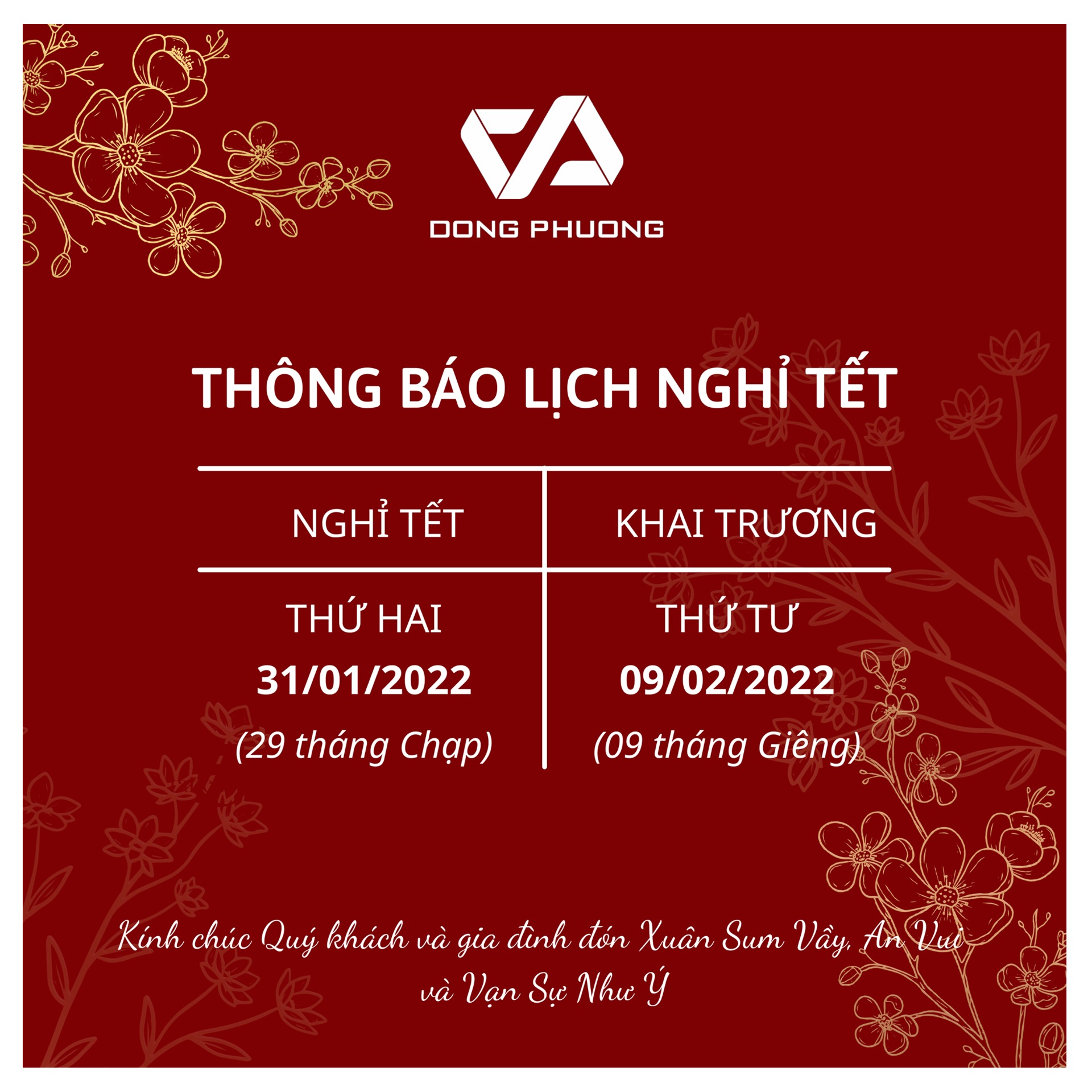 CÔNG TY TNHH NHÔM KÍNH ĐÔNG PHƯƠNG thông báo lịch nghỉ Tết Nguyên Đán 2022 như sau: