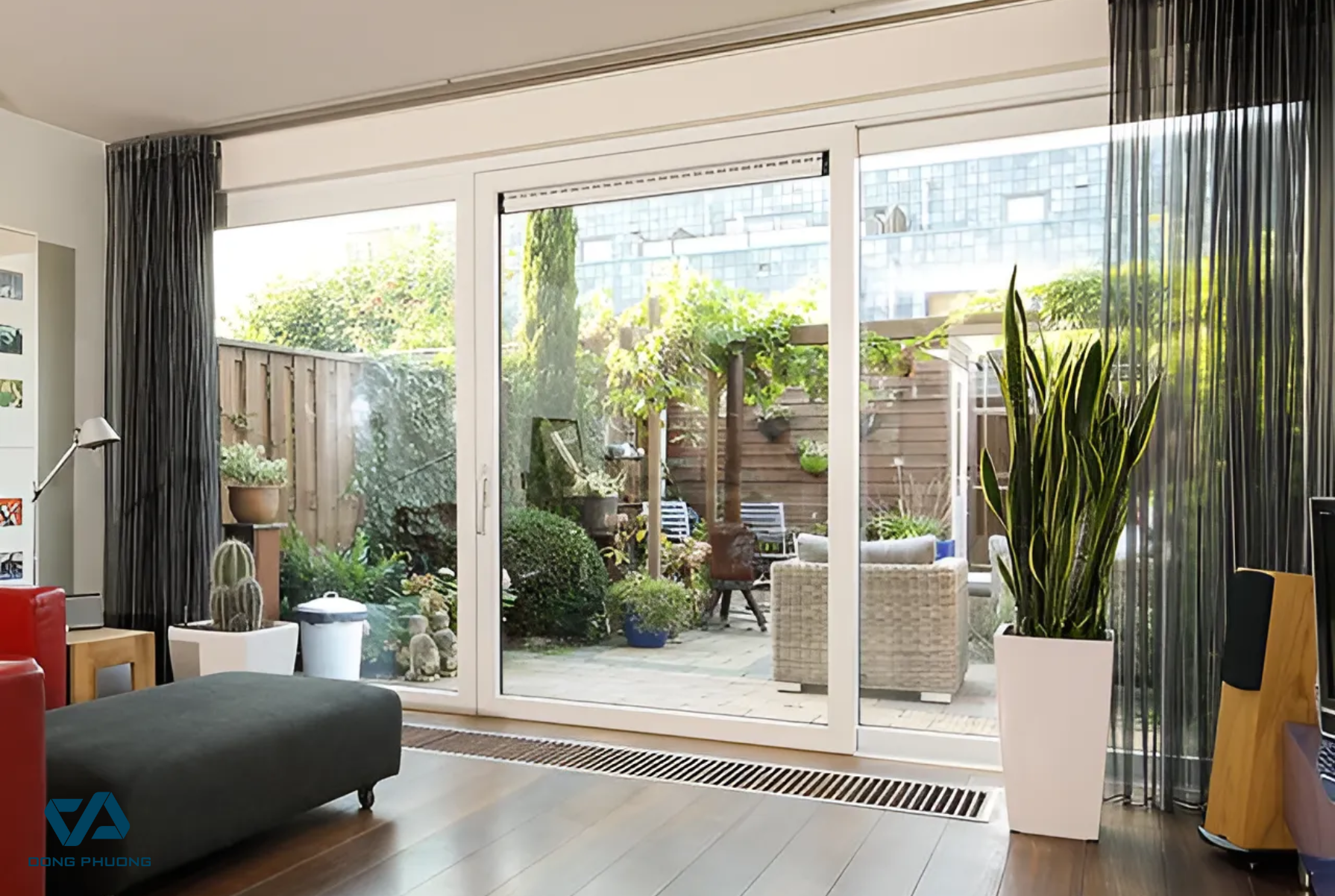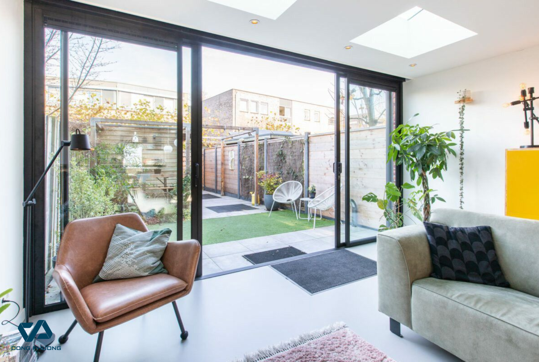 - Cửa trượt xếp trượt (folding door) – tạo không gian mở liền mạch giữa phòng khách và sân vườn.