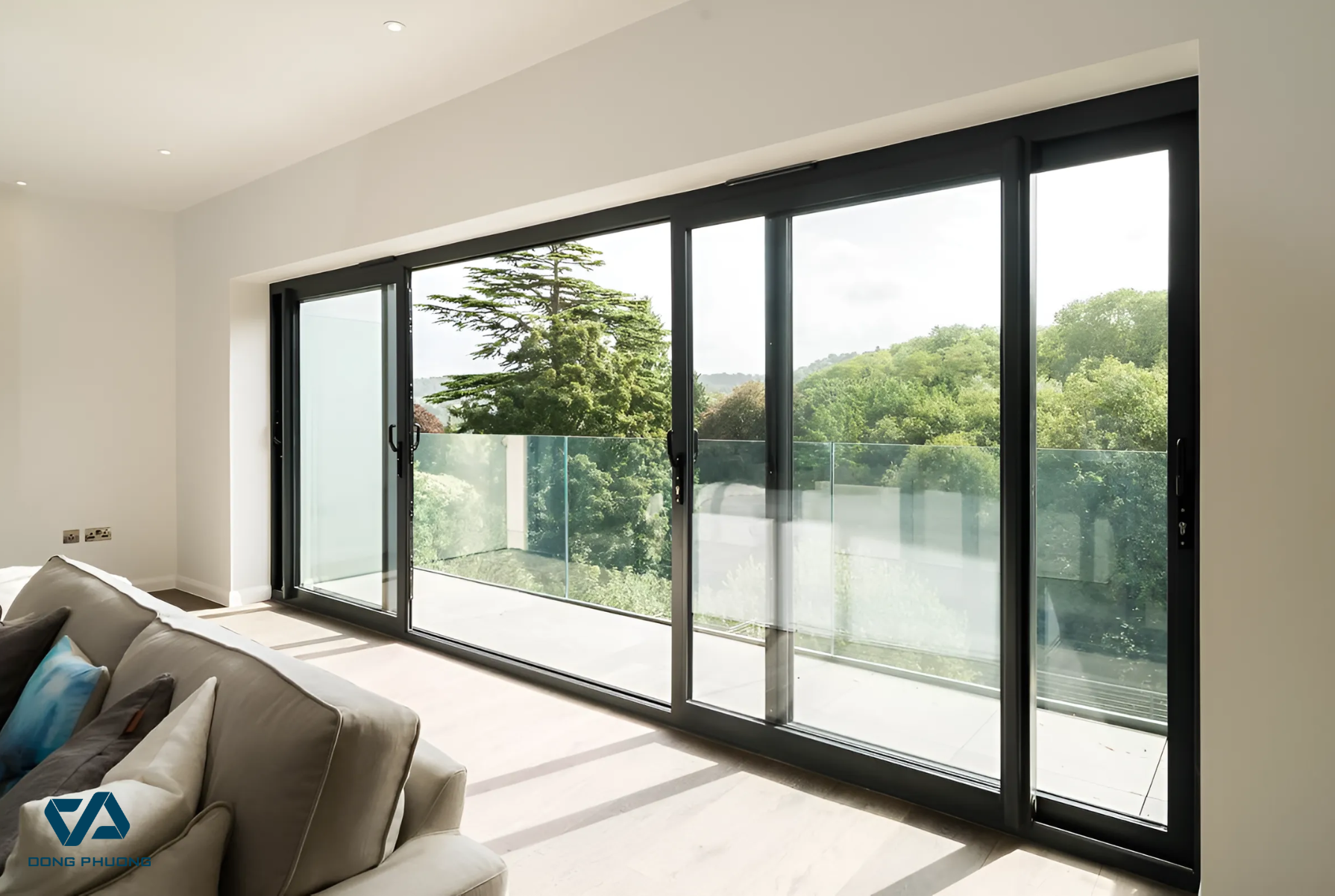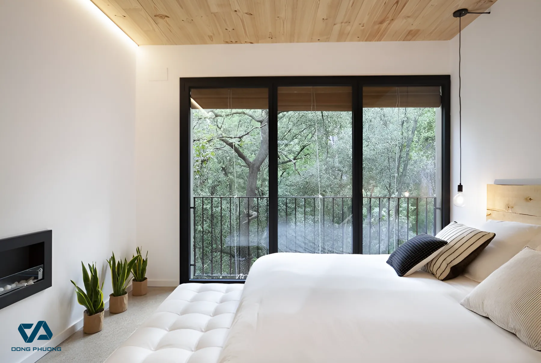 - Cửa ban công trượt ngang, khung mảnh, gọn gàng.