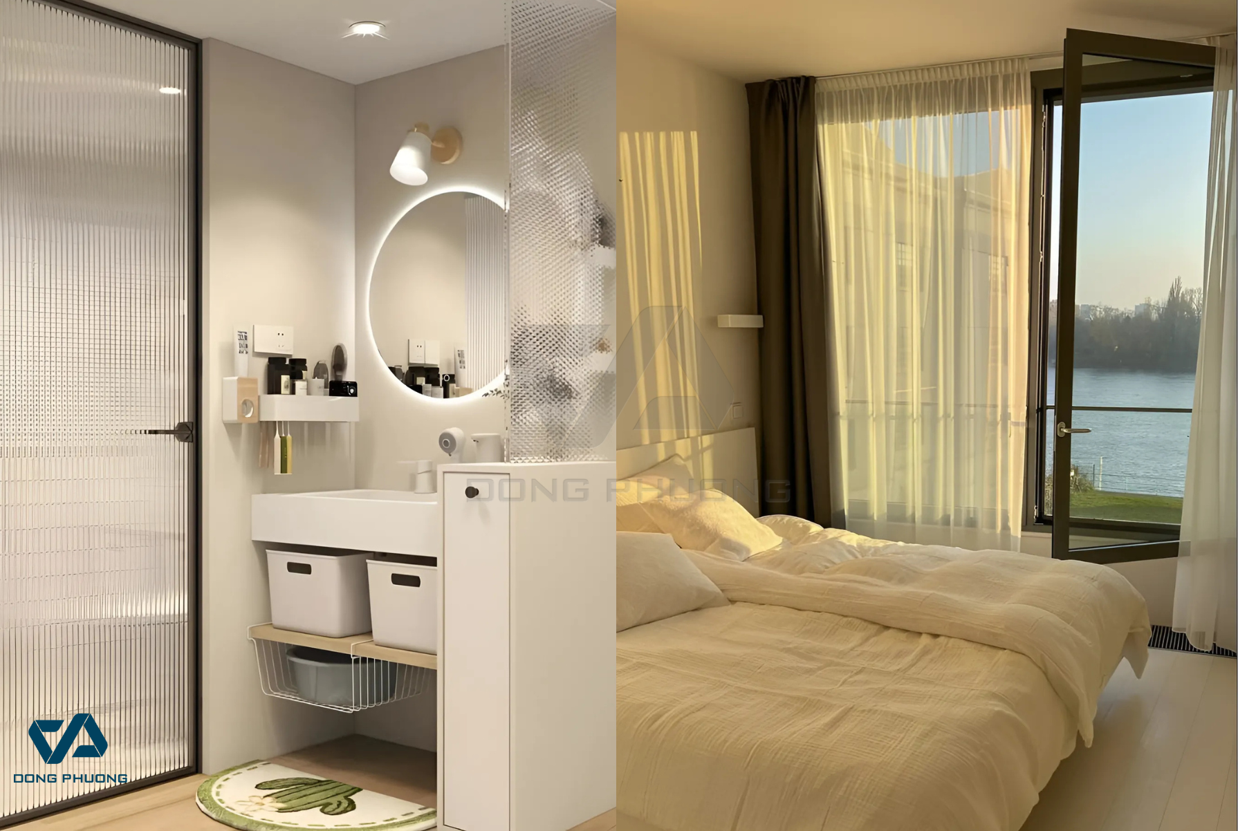 Cửa phòng tắm kính sọc và cửa ban công mở quay (Nguồn: Internet)