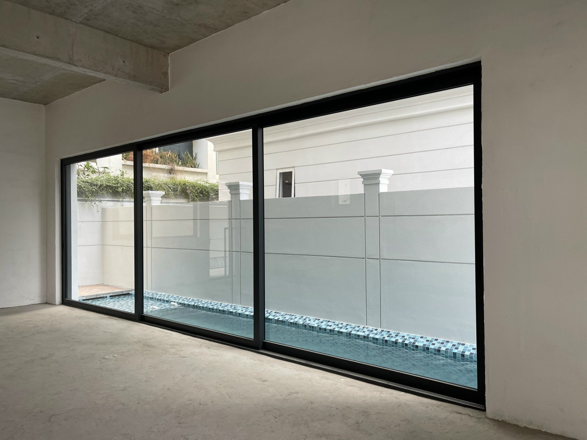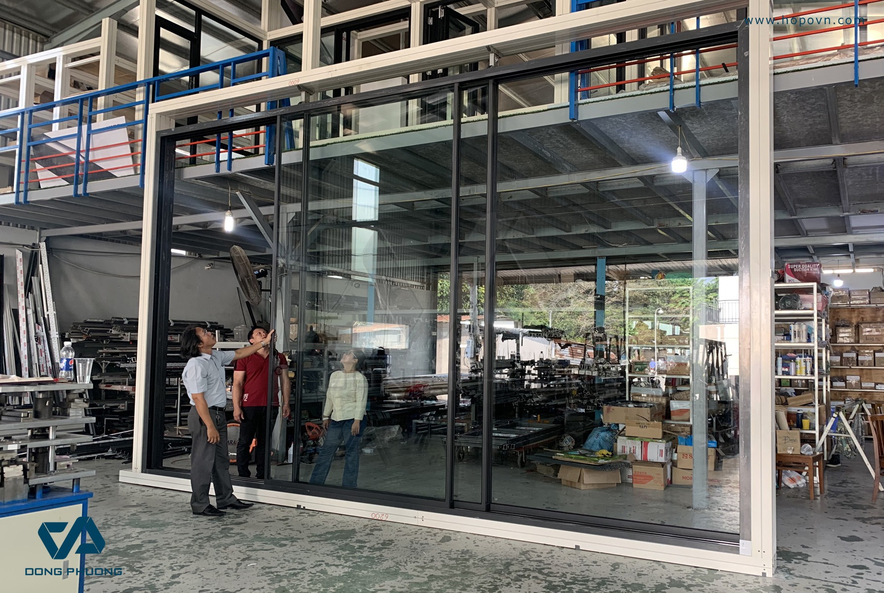 Cửa lùa slim tại nhà xưởng. Hình ảnh bộ cửa test trước khi được đem đến lắp tại công trình thực tế