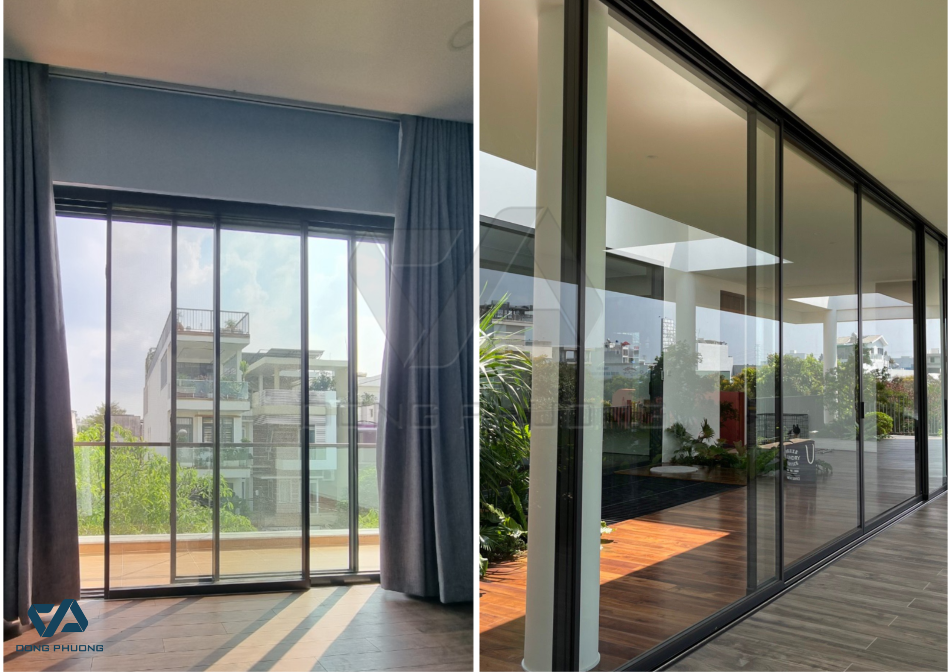 - Hệ thống thanh profile nhôm slim không cầu chuyên dụng, đảm bảo tính thông thoáng tốt, tăng độ truyền sáng và mở rộng tầm nhìn.