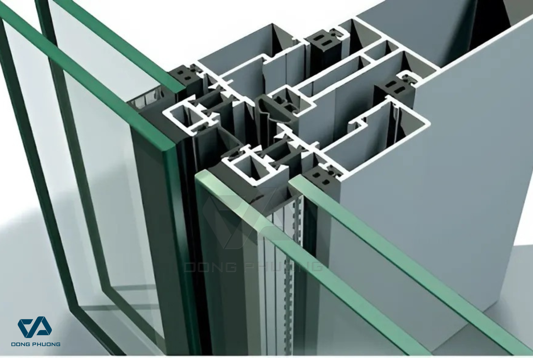 Mẫu góc mô phỏng cửa Nhôm Kính hộp với thanh nhôm đa khoang và hệ phụ kiện kín khít giúp cách âm tốt
