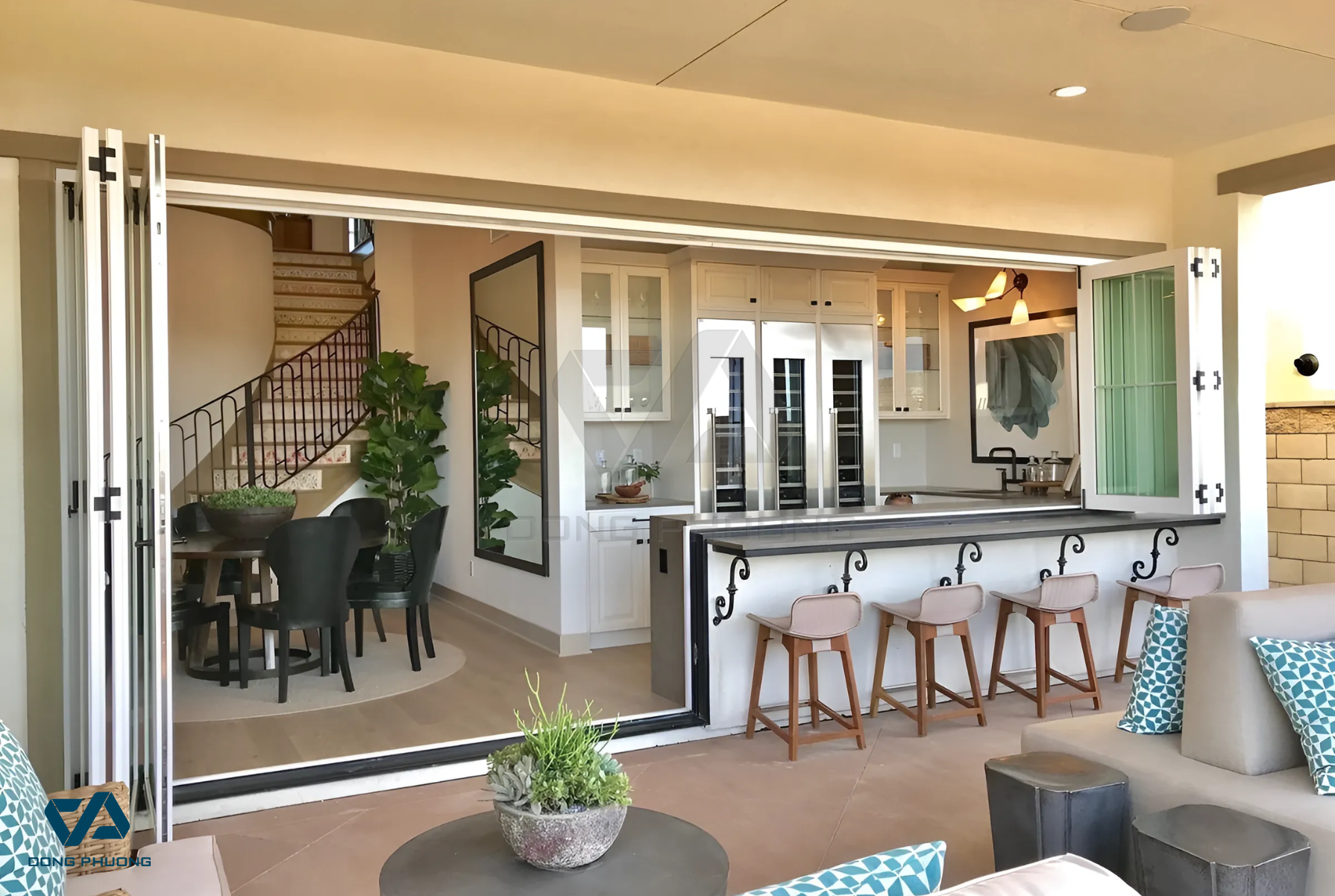 - Cửa trượt xếp gấp (folding): Khi cần mở rộng tối đa không gian, đặc biệt là khu vực liên kết giữa phòng khách và sân vườn, cửa xếp gấp giúp tạo “bức tường kính” linh hoạt – mở ra khi cần tiệc tùng, đóng lại khi cần riêng tư.
