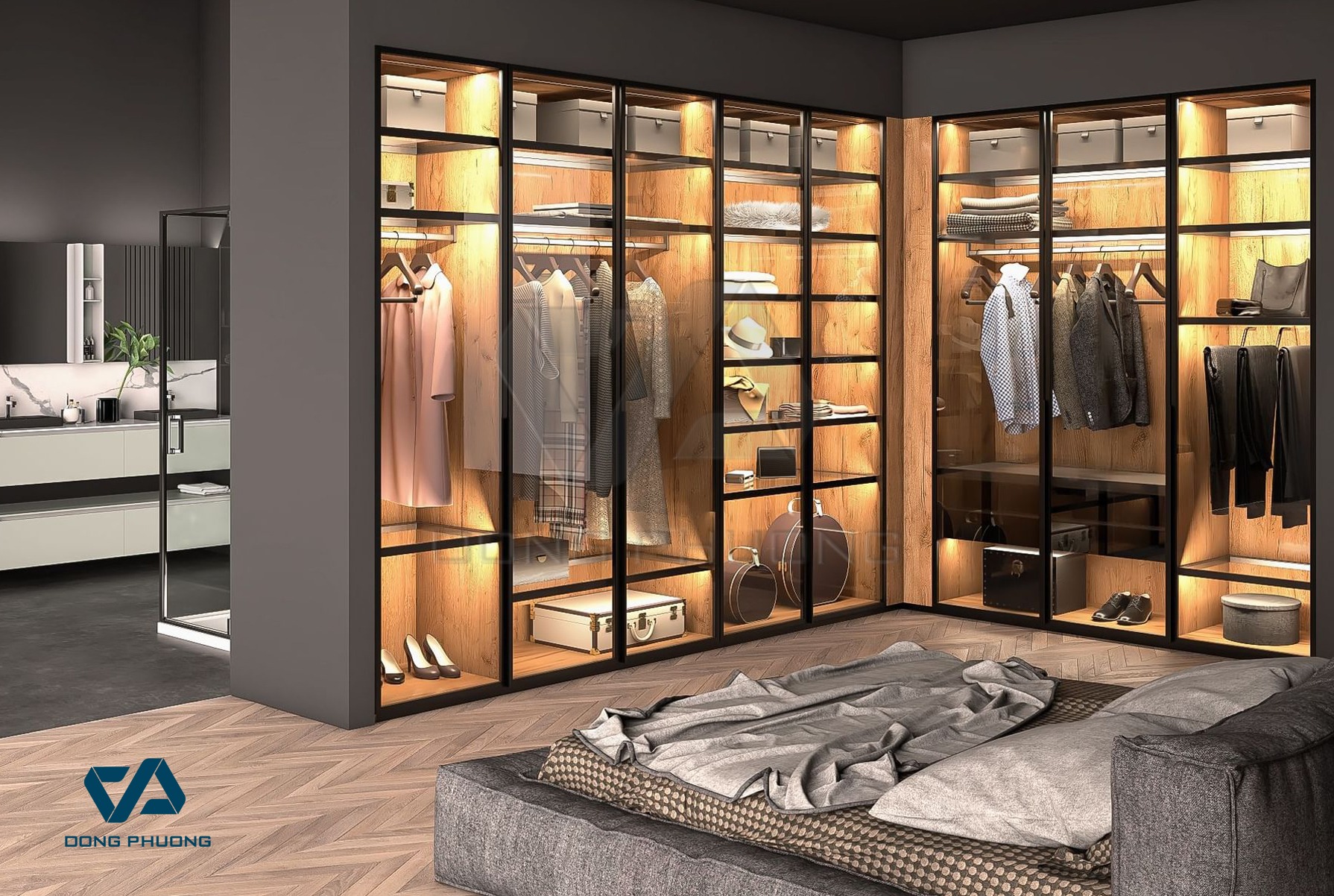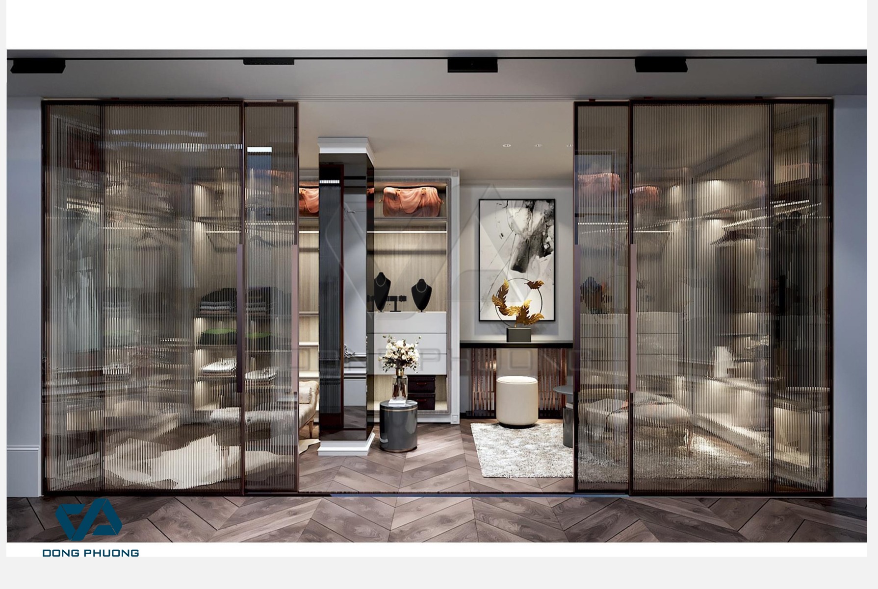 Chi tiết tủ cánh kính. Khung nhôm màu đồng/ màu xám với kính màu trà hoặc màu trong kết hợp với đèn led bắt sáng ở nhiều vị trí. Cho bộ tủ trở nên lộng lẫy, nổi bật giữa căn phòng.