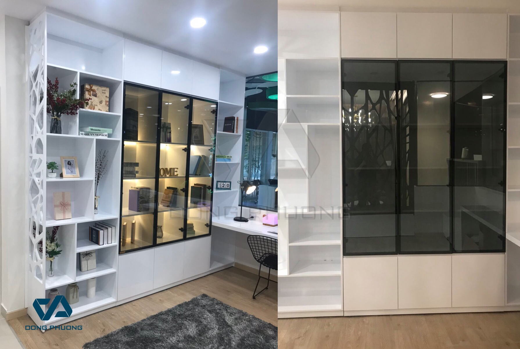 Tủ cánh kính là sản phẩm từ nhôm kính đòi hỏi sự tỉ mỉ hơn trong việc lựa chọn vật liệu: màu sắc khung nhôm, loại kính, phụ kiện, màu đèn led, để có được sản phẩm hoàn thiện phù hợp với không gian.