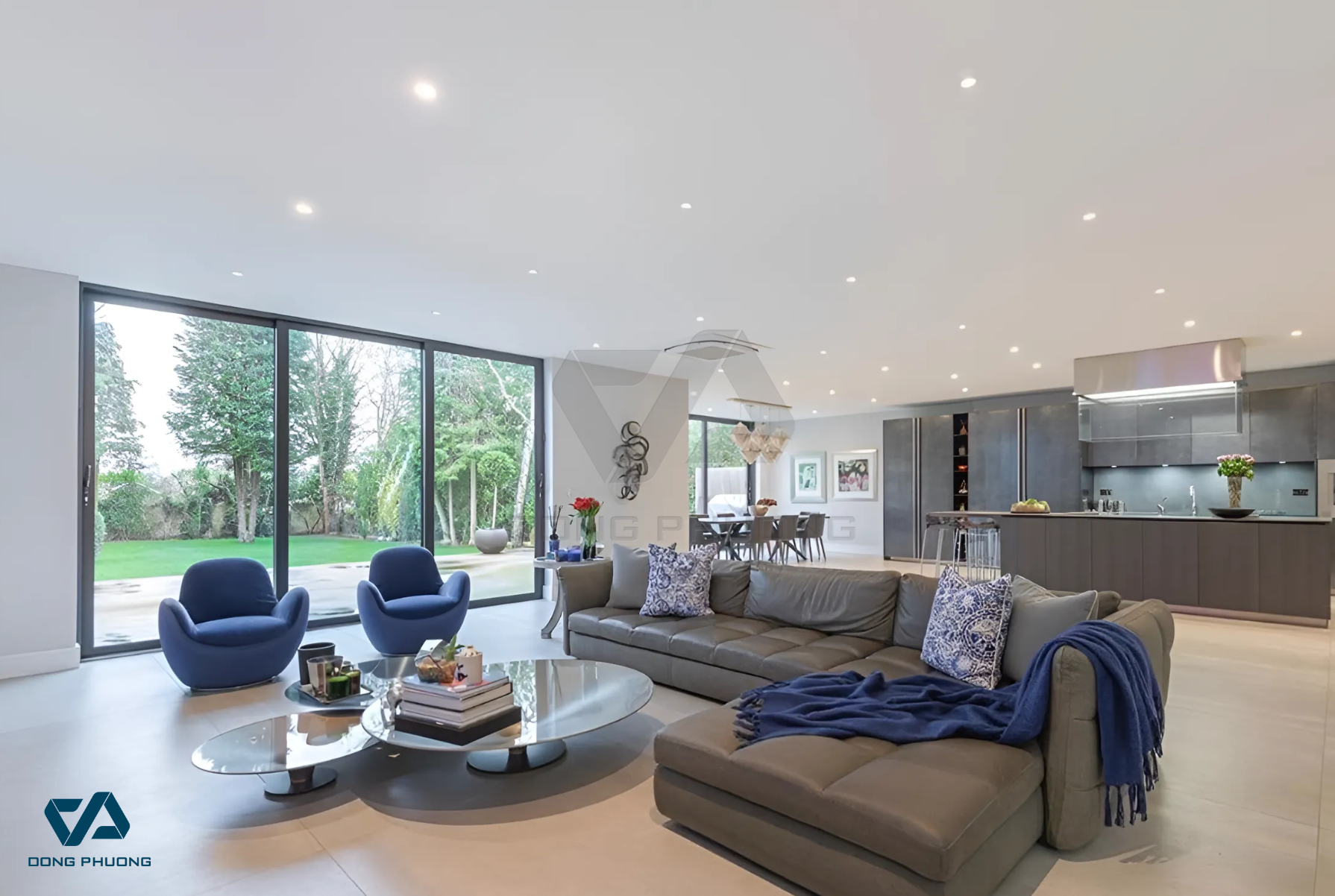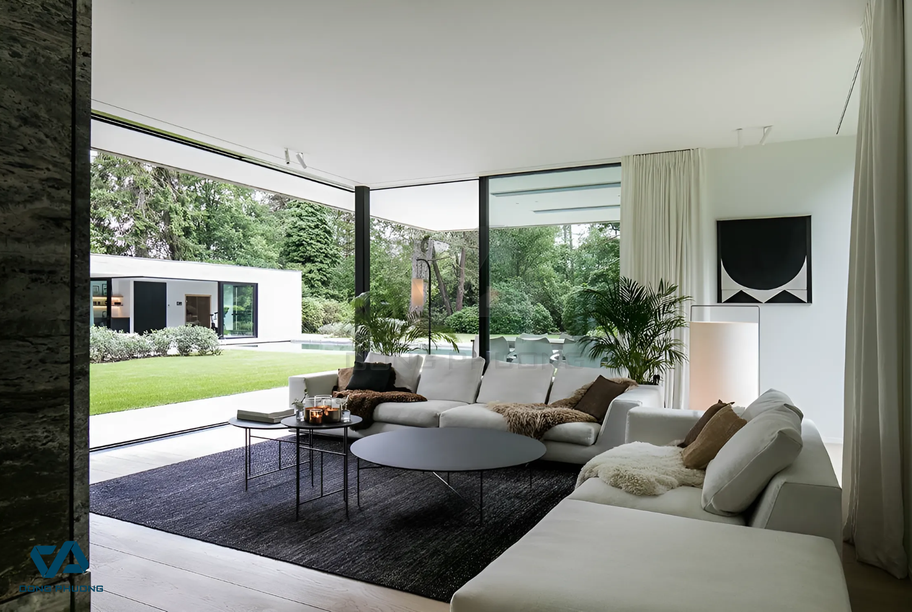 Một trong những “điểm cộng” lớn nhất của cửa nhôm kính là xóa nhòa ranh giới giữa không gian nội thất và cảnh quan sân vườn. Phòng khách mở ra khu vườn xanh mát, hồ bơi hay tiểu cảnh đều trở thành một phần của ngôi nhà. Đây chính là trải nghiệm sống “resort tại gia” mà nhiều chủ biệt thự mong muốn.
