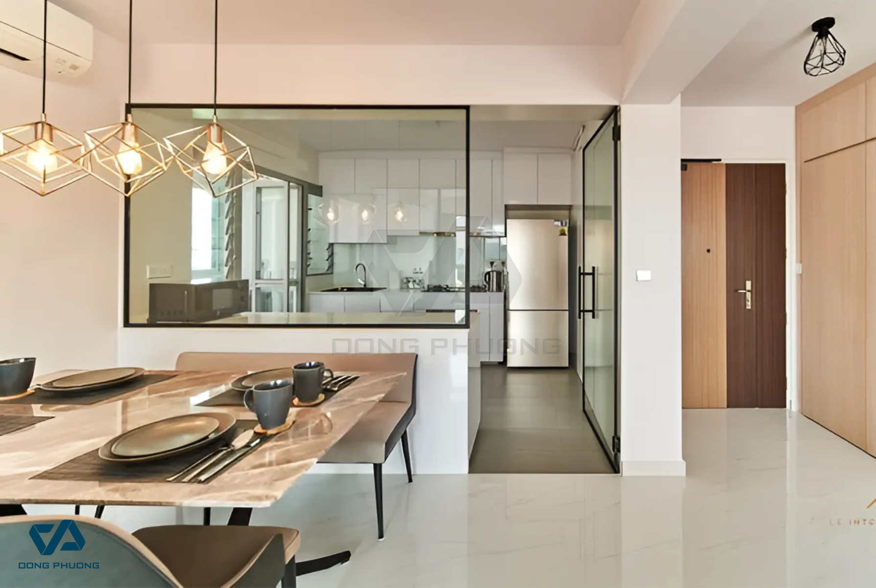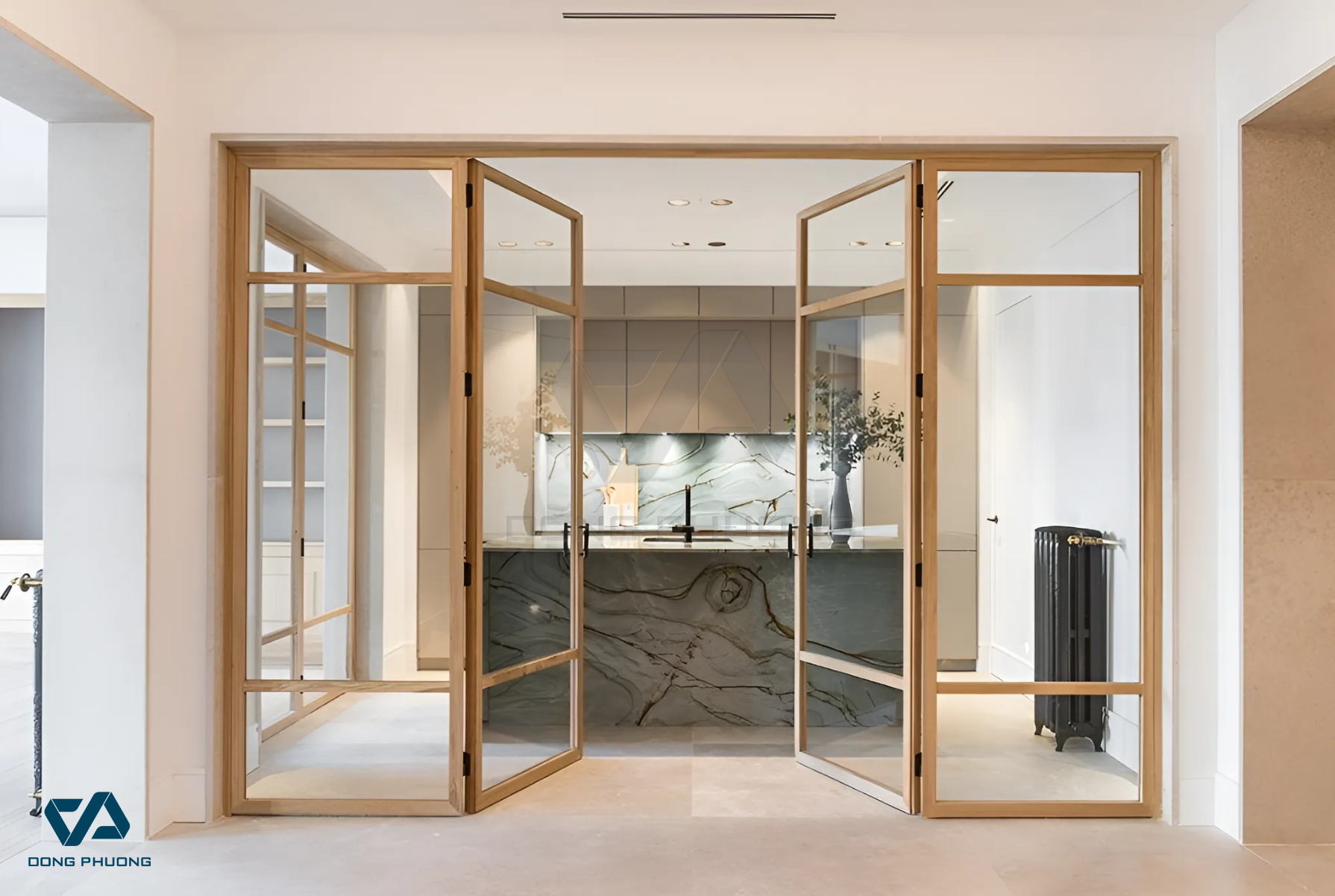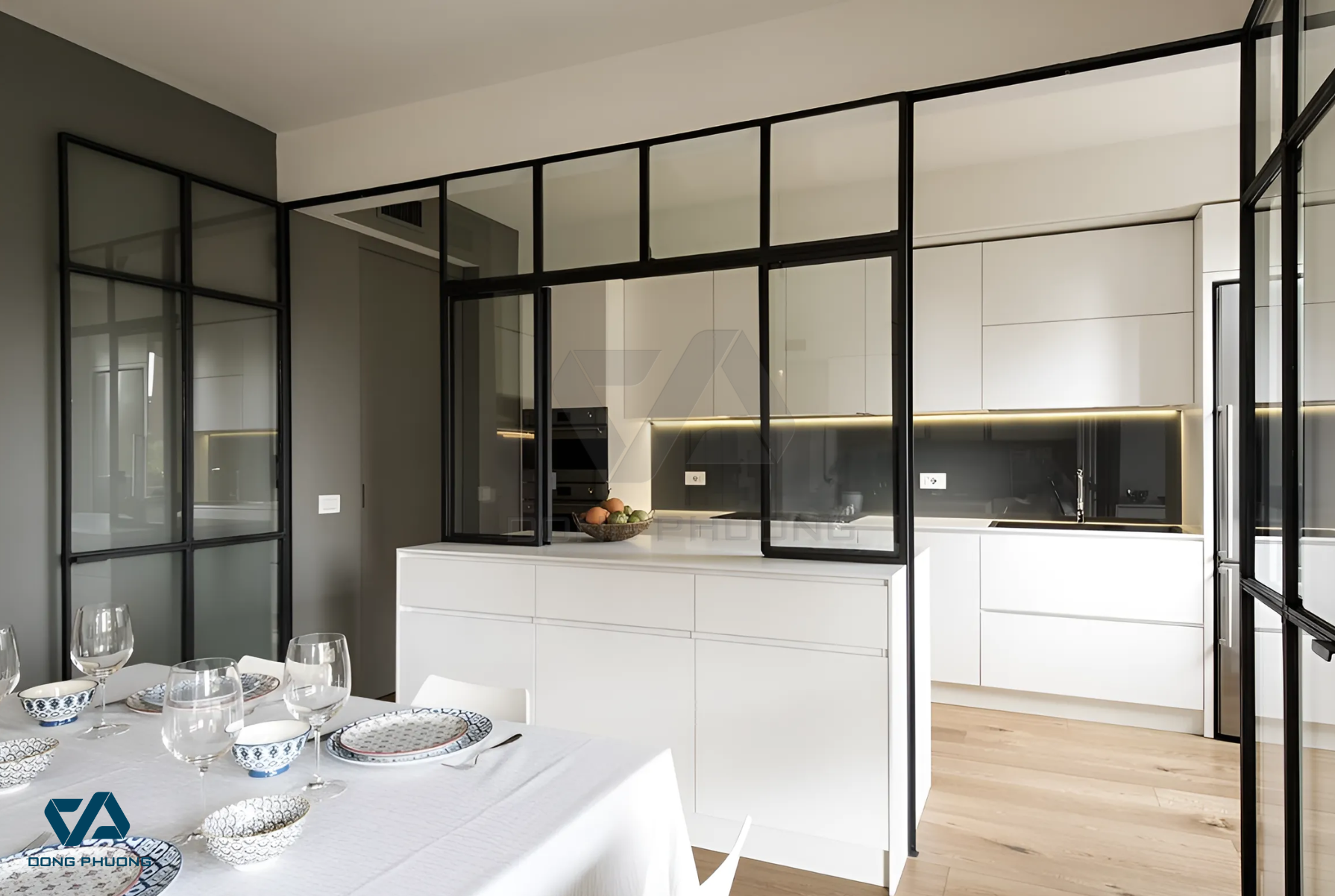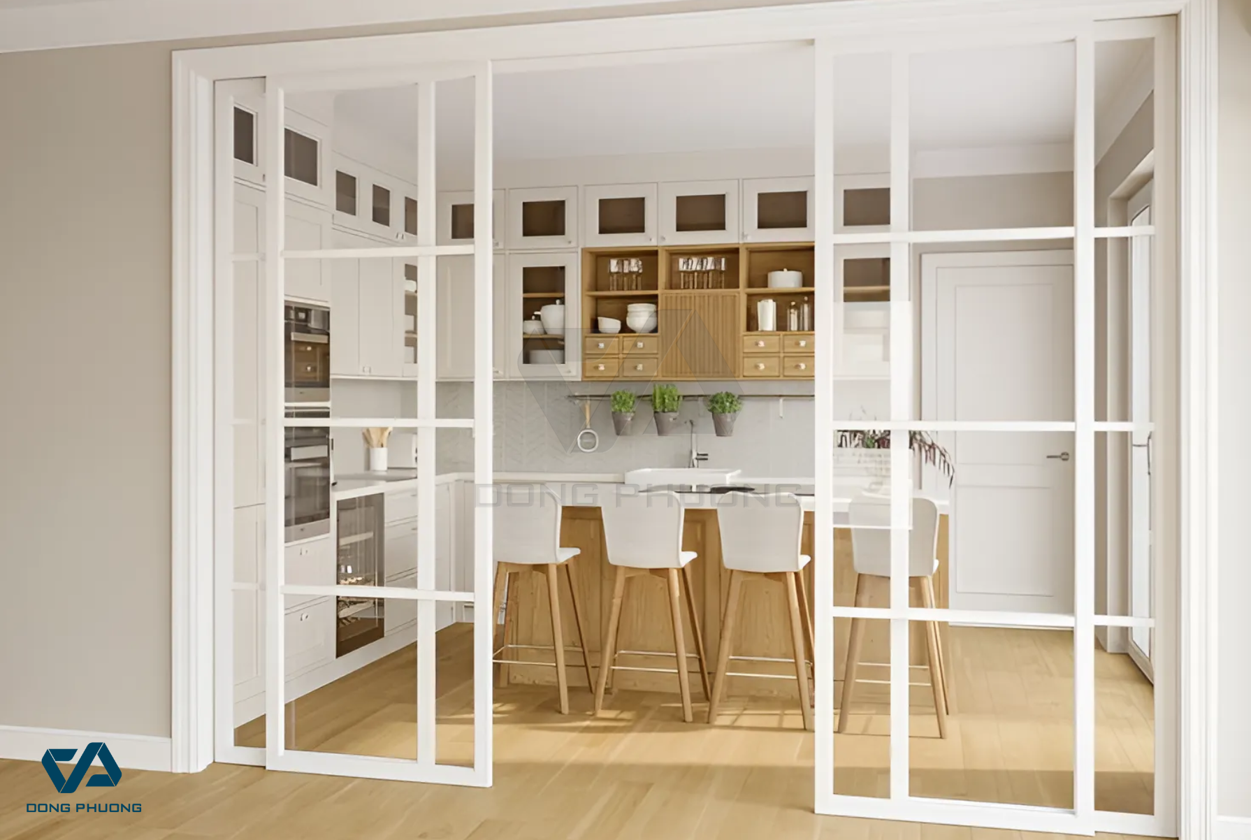 → Cửa kính là lựa chọn lý tưởng cho không gian mở vì giúp lấy sáng tốt và tạo sự thông thoáng. Tuy nhiên, nên sử dụng kính cường lực, kính mờ hoặc kính phản quang để tăng tính riêng tư và hạn chế mùi khi nấu ăn.